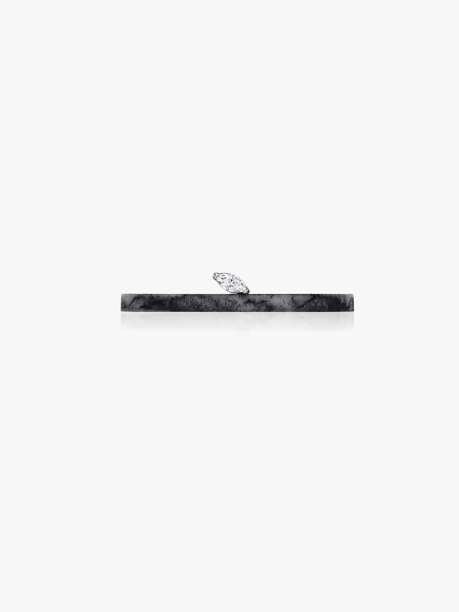 The Axis Ring in Shadowed features a textured surface of 100% biodegradable PHA with stone-like patterns, accented by a marquise-cut diamond. Plated in 18K white gold over sterling silver, it blends sustainability with modern luxury. Customizable to your style, it’s a timeless piece of refined elegance.
