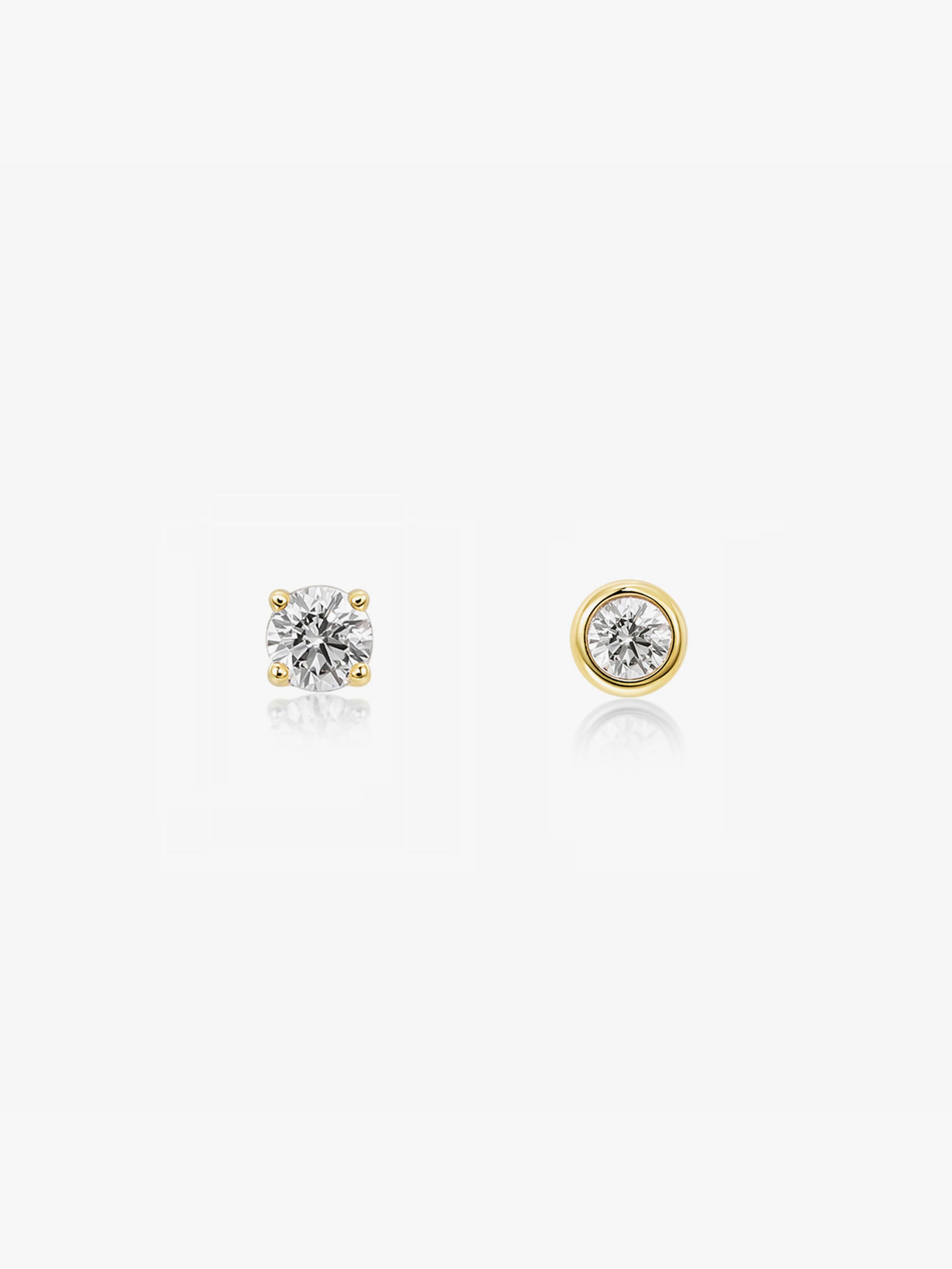 LEPOON Solitaire Studs pair a bezel-set diamond with a prong-set one—one natural, one lab-grown. This quiet contrast invites a gentle value guess: which is which. Also available in an all-lab-grown option, the design complements any style.