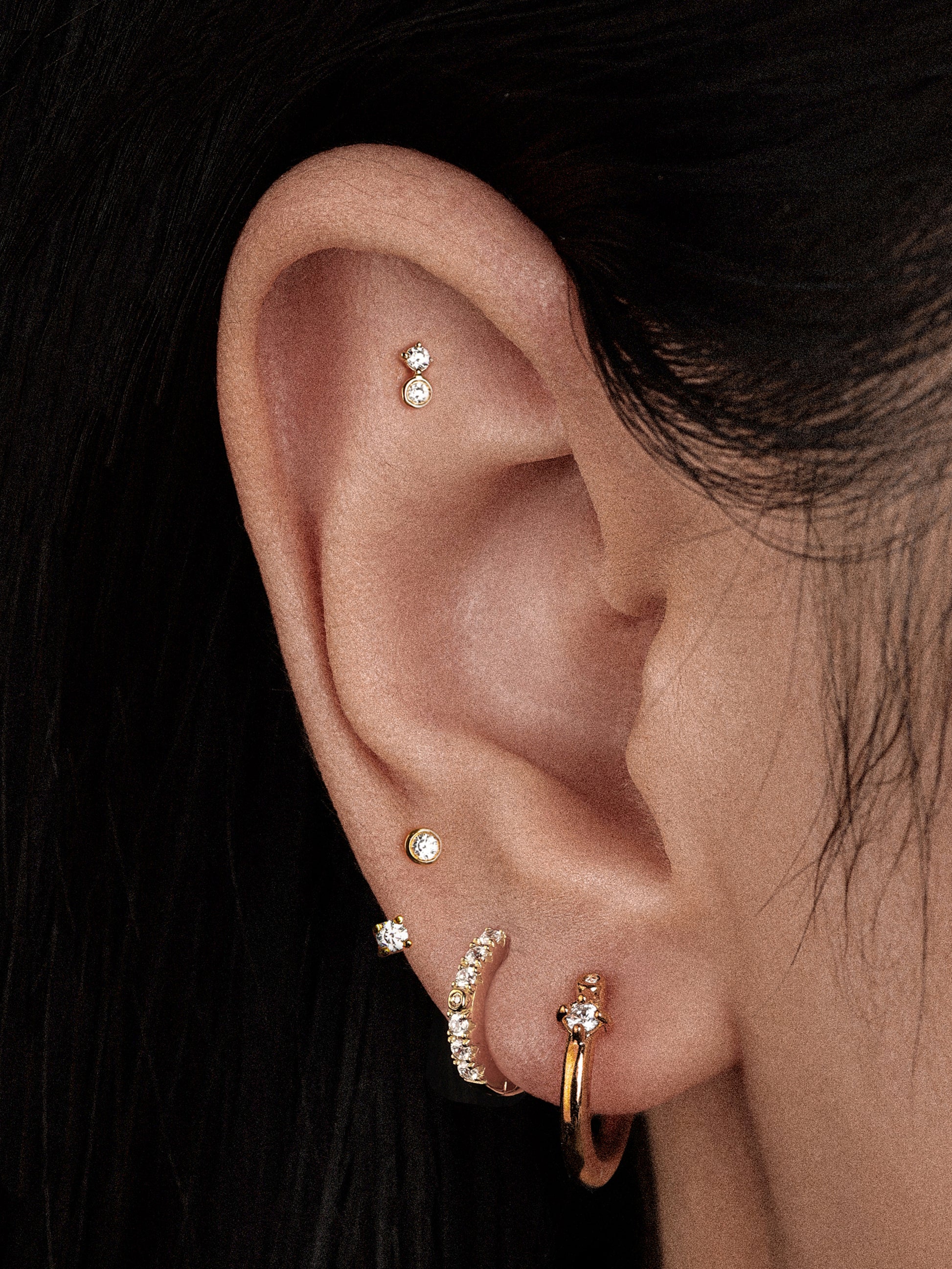 LEPOON reimagines the classic solitaire with a dual setting—bezel and prong—exclusive to the Terrean Capsule. The versatile Ear Jacket pairs with any LEPOON stud for a playful, personalized look.
