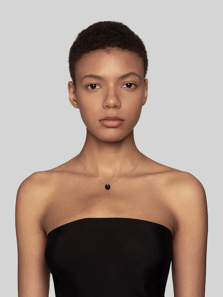 The necklace features a classic pear-shaped lab-grown diamond set in layered carbon fiber, paired with cubic zirconia—creating a distinctive look that effortlessly complements elegant styles.