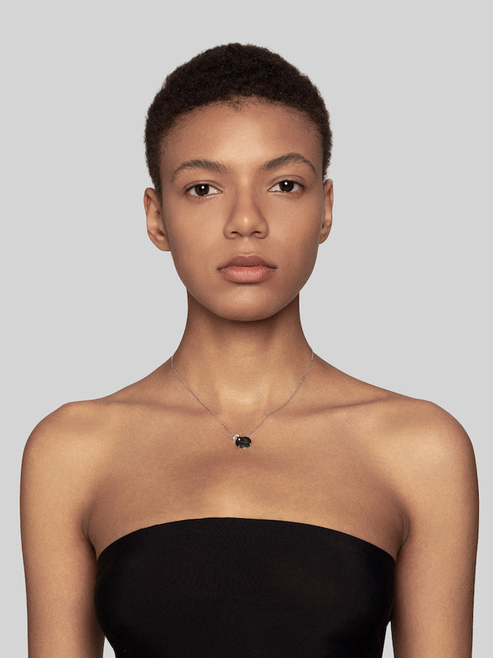 The necklace features a classic round lab-grown diamond set in layered carbon fiber, paired with cubic zirconia—blending unique design with refined elegance, perfect for adding a touch of distinction to everyday wear.