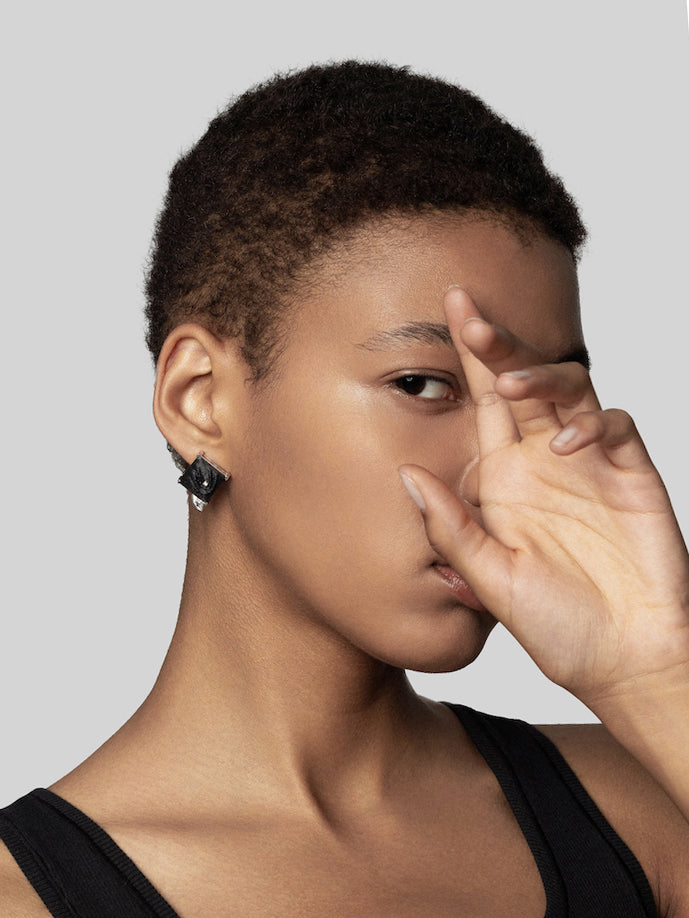 Classic round lab-grown diamonds set in layered carbon fiber, paired with cubic zirconia, turn material contrast into a vivid visual—perfect for daily wear with a playful, unique flair.