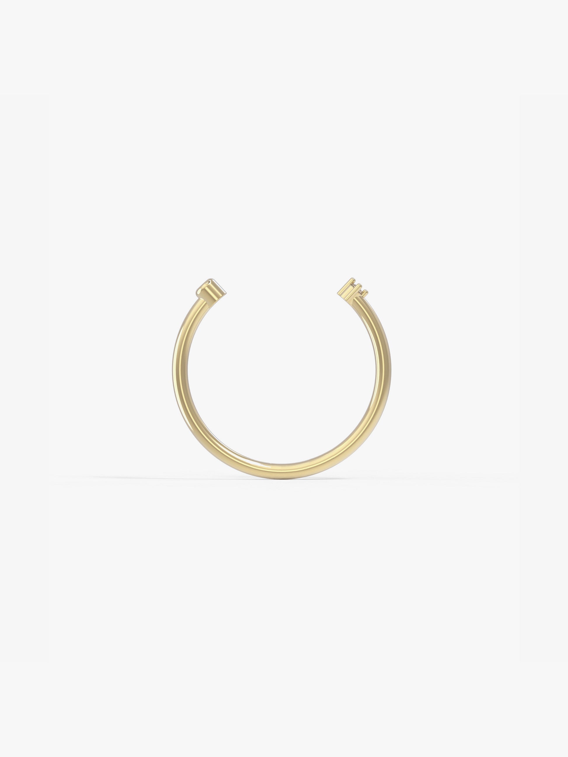 The Tiny Cuff Ring features two Round Brilliant lab-grown diamonds—one prong-set, one bezel-set—on a delicate 18k gold-plated band. Its open design ensures a flexible, elegant fit.
