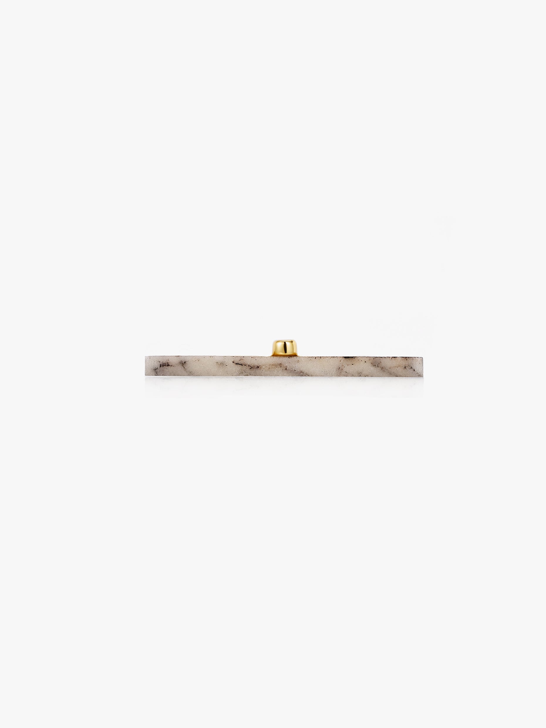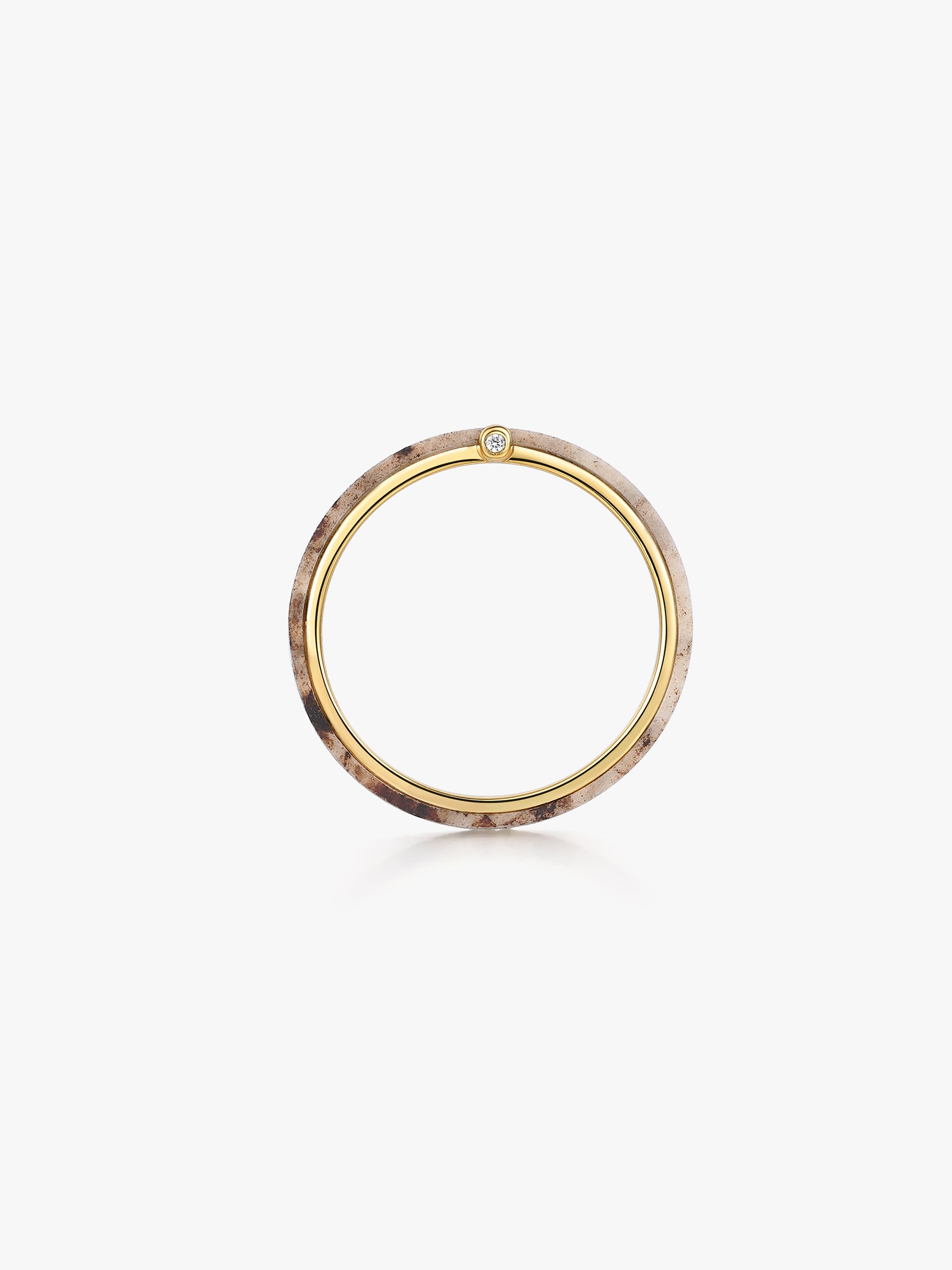 The Verto Ring features a bezel-set lab-grown diamond on the side, set against a marbled PHA outer layer that evokes organic movement. With a recycled silver band plated in 18K gold, this subtly off-center design combines unique elegance with sustainable materials.